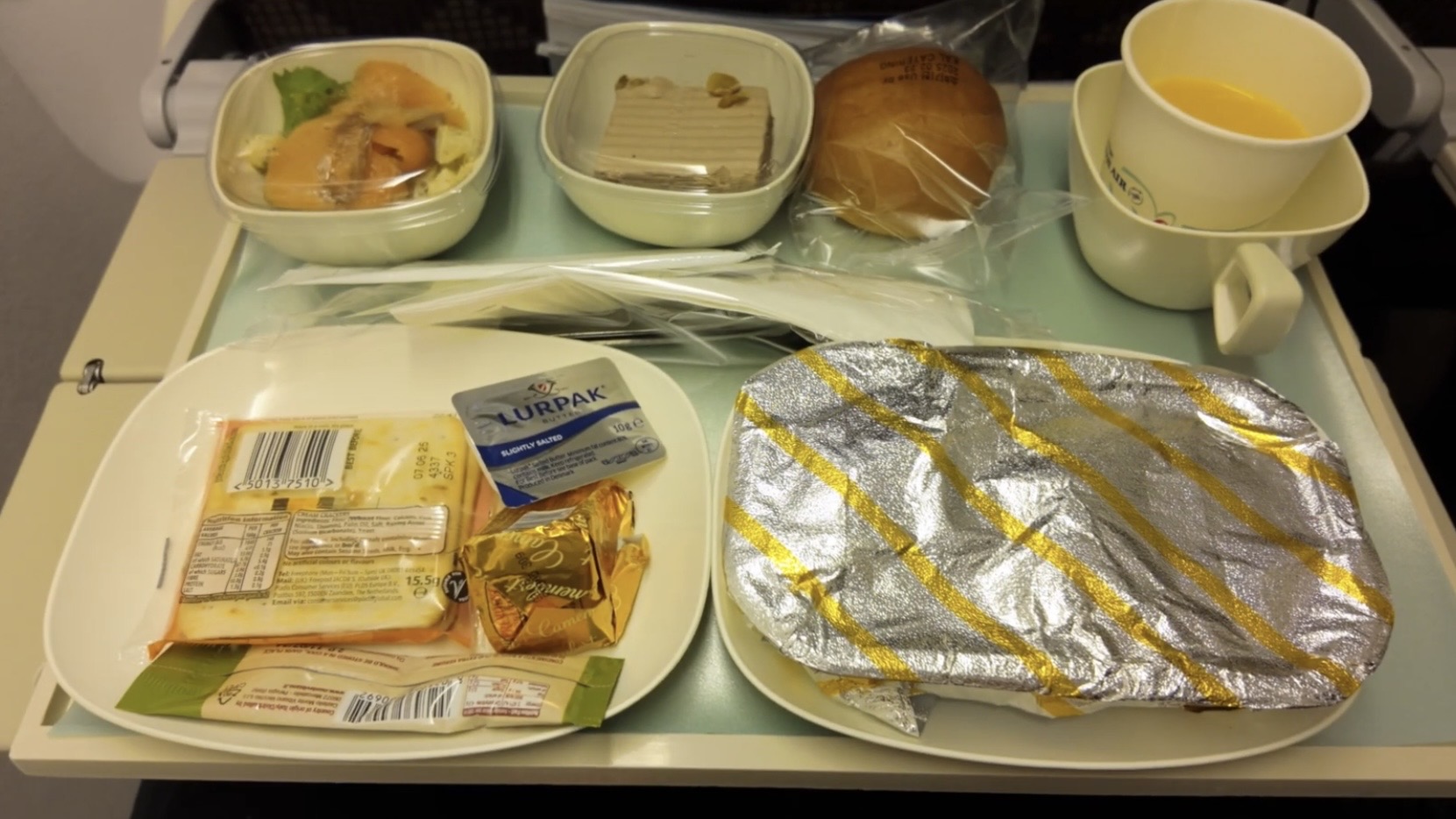 機内食は、離陸後・着陸前の2回と、その間に軽食が1回ありました。